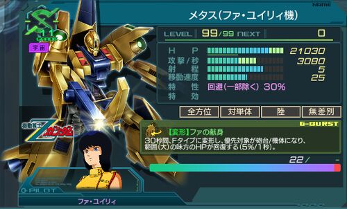 リプレイド用に組んでみました。 HP46,266・回避90% 変形中の範囲回復は大いに貢献できそう。 自機は毎秒2,313回復します。 さて実際の使い勝手はどうか…?